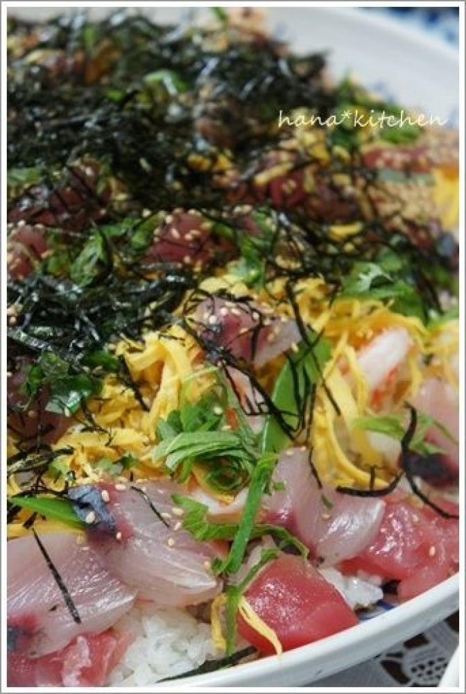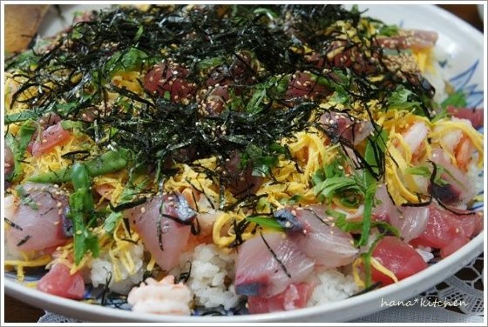 干しシイタケの煮物。高野豆腐の炊いたん。などなどを混ぜて盛り付けたあと、お刺身や、大葉、絹さやなどを飾り付けました。