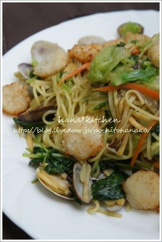 フライパンにアサリを入れて蓋をし、口が開いたら野菜類を加えて炒める。