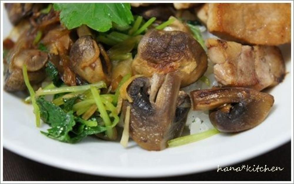 フライパンに油をしき、マッシュルームを炒め、横で豚肉を焼く。