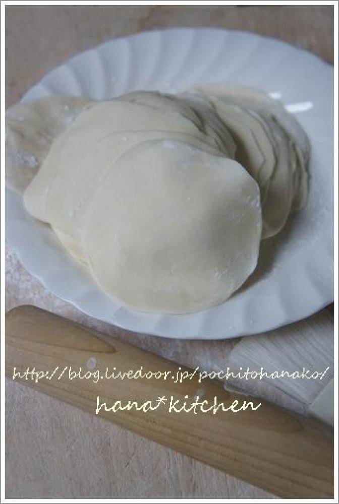 ![]() 打ち粉には片栗粉を使っています。少なすぎると、皮がくっついてしまいます。1枚皮ができたら、すぐに包むという進行で、私は作