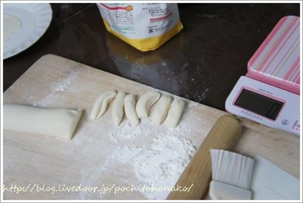 ![]() 棒状に延ばし、5mm程度ずつ切ります。(目安は1枚分が8~9g)