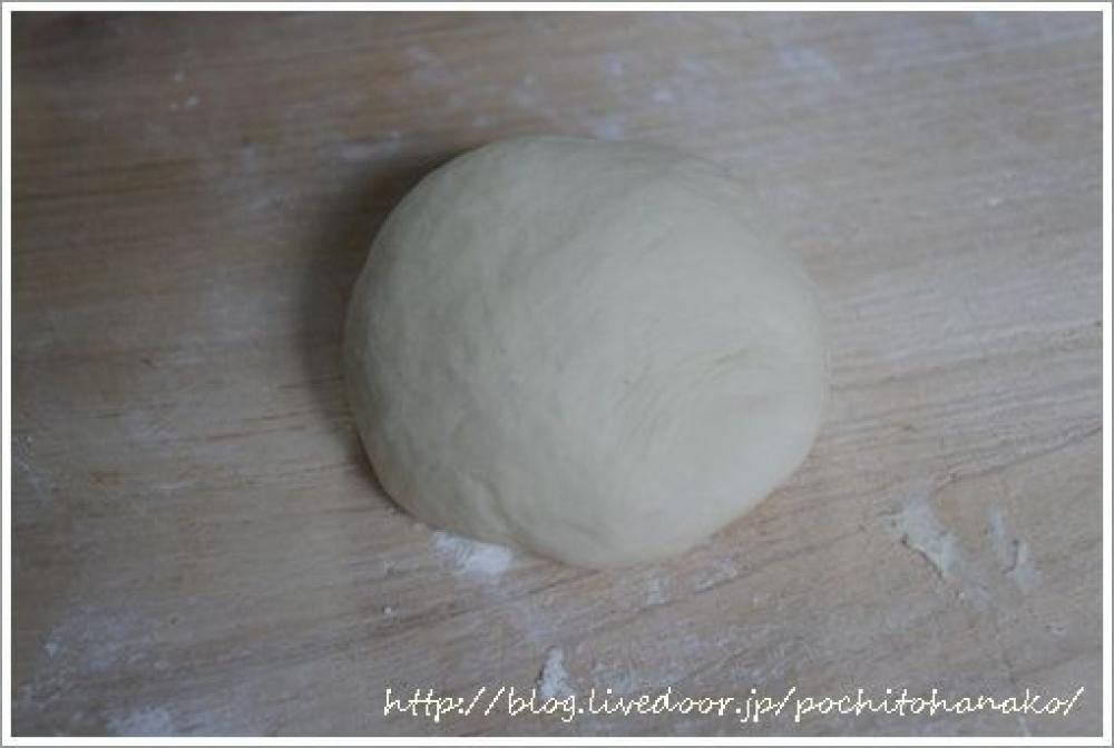 ![]() ざっくり混ぜてから打ち粉をしたまな板に移し、手で捏ねてひとまとまりにします。こちらは、薄力粉。つるんとした表面でしょう?