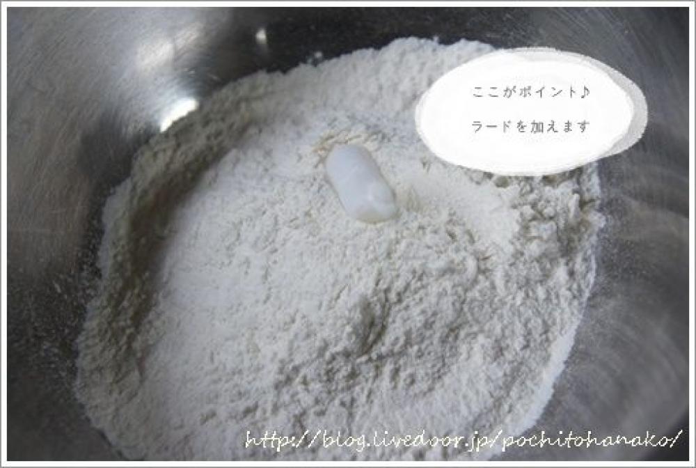 ![]() 粉をボウルに入れ、ラードを加えます。ラードを加えることで、カリっと餃子が焼き上がります。