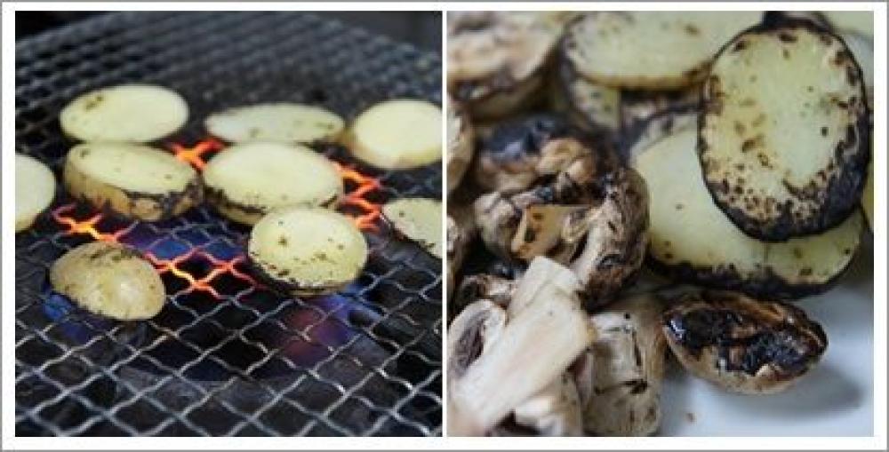 ![]() 鮭、茄子、マッシュルーム、ジャガイモを網でさっと焼いておく。(素材のうまみに香ばしさが加わります。ちょっとひと手間を♡)