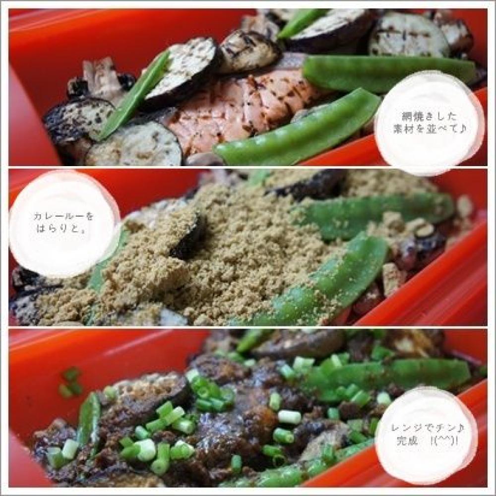 ルクエに、鮭を真中に置いて他の素材を周りに並べる。そのうえから、ハウス プライムバーモントカレーをほぐしながらふりかける