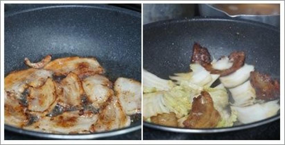 ![]() フライパンで豚バラ肉をじっくり焼き、火が通って焦げ目がついたら野菜を加える。※葱と白菜の軸を先に加えて下さい。