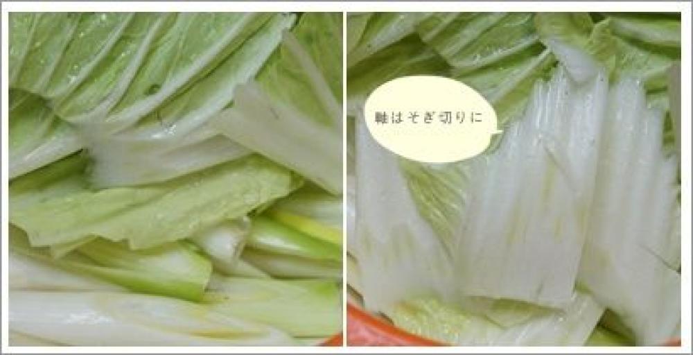 ![]() 長ネギを斜め切り、白菜を軸部分は2等分したあとそぎ切りに、葉の部分はざく切りにしておく。
