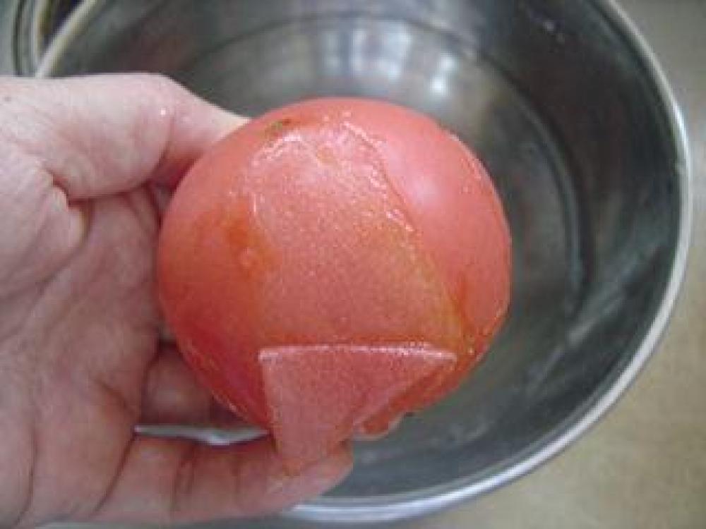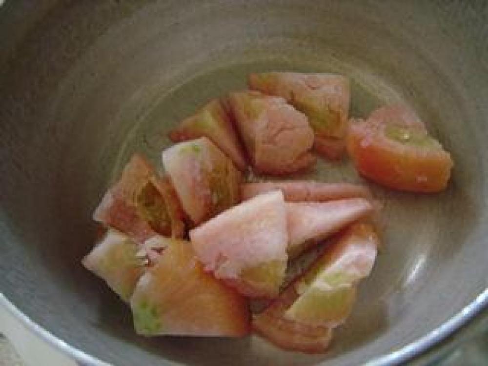 ![]() ボールに水を入れ、冷凍トマトを浸し、皮を剥きます。
