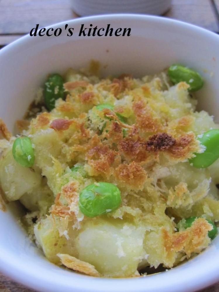 あついうちに皮付きのまま1.5cm角くらいにカットし、*の調味料と枝豆を混ぜ合わせる。