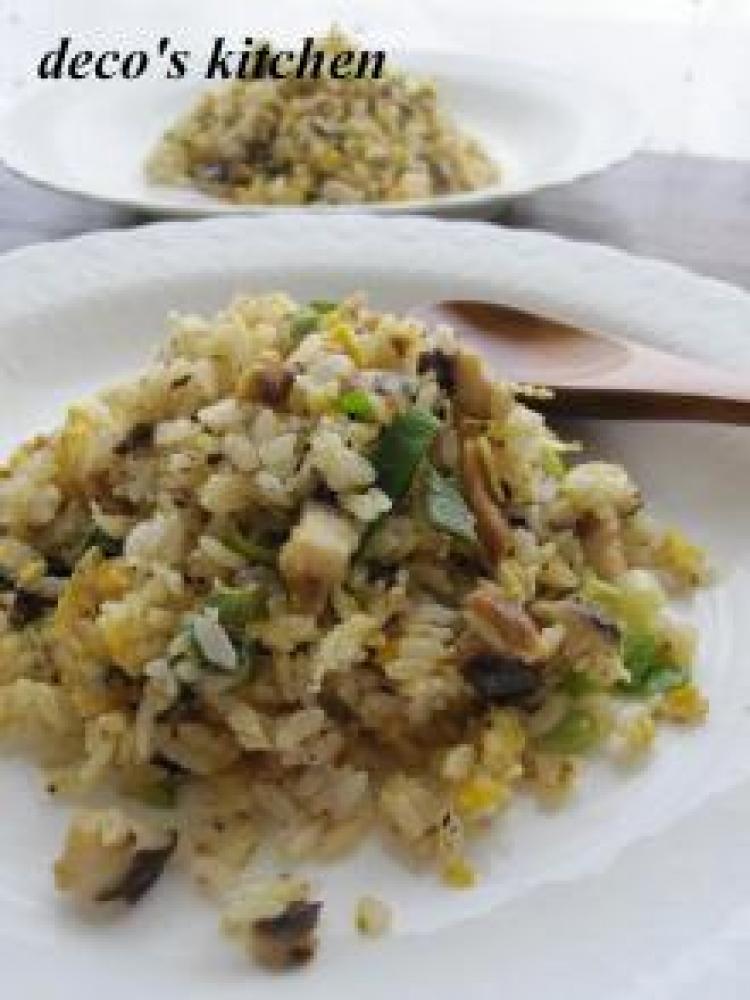 長ねぎとしいたけを加え、塩こしょうをふり(分量外)、炒める。