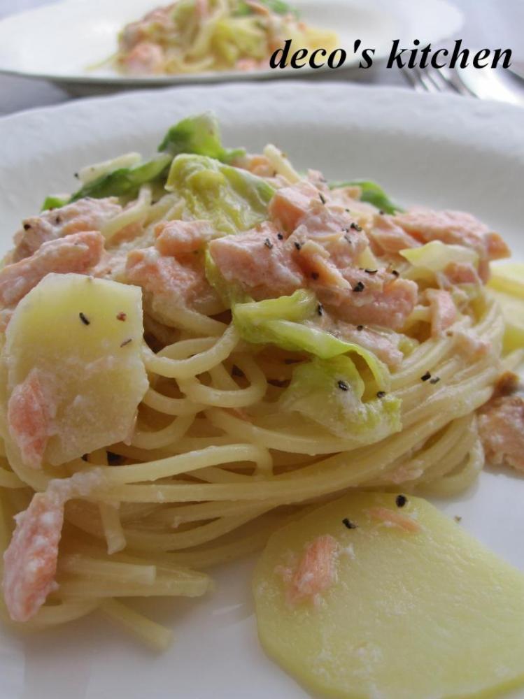 鮭を加えて白ワインをふる。☆を加え(パスタのゆで汁のみ後で)、じゃがいもがやわらかくなるまで(5~10分)弱火で煮る。
