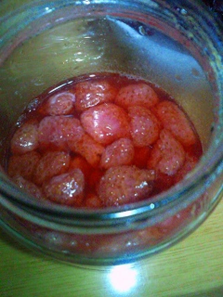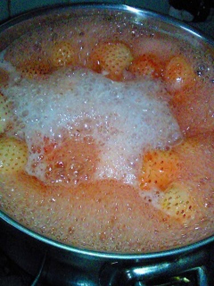 ![]() アクをとりながら、いちごがつぶれない程度で半分の量に減るまで煮詰める