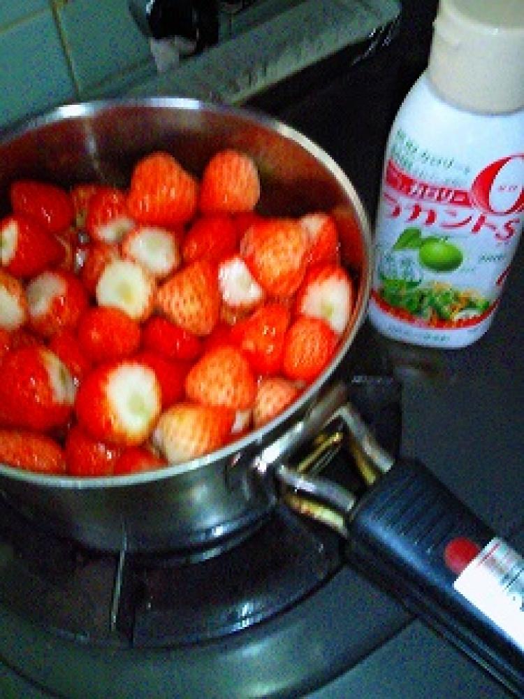 ![]() 鍋にラカントS液状といちごを入れて火にかける