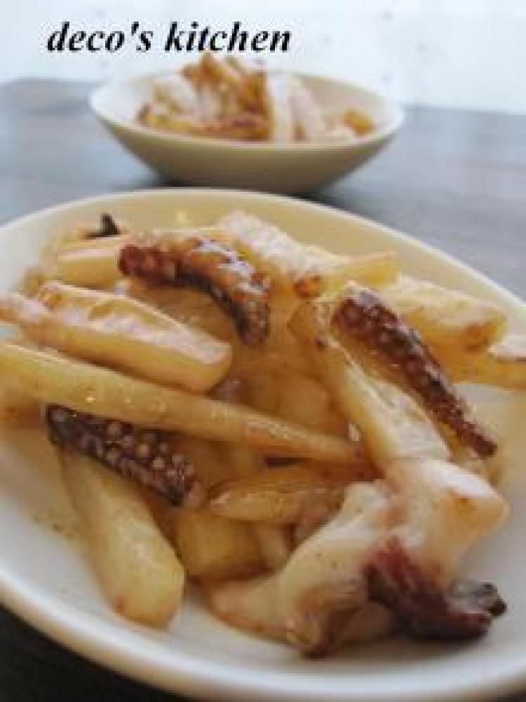 イカに半分くらい火が通ったら、長いも+塩を加えてさらに炒める。