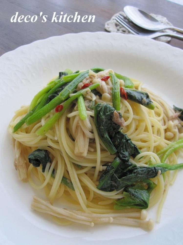 パスタをゆではじめる。フライパンにオリーブオイル+にんにく+赤唐辛子を入れて火にかけ、香りがたったらツナを入れて炒める。
