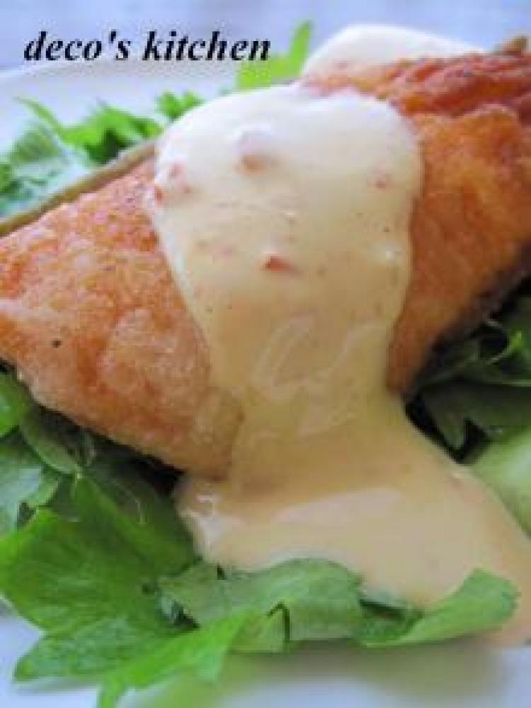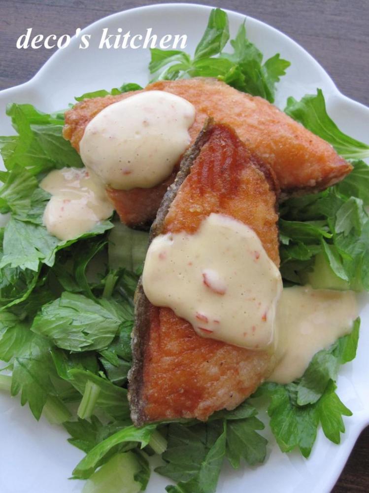 ![]() お皿にセロリを敷いて、鮭を盛り、☆を混ぜ合わせたソースをかけて、完成♪