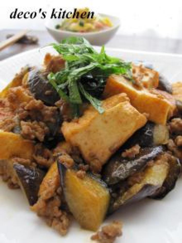 お肉の色が変わったら、茄子を加えて炒め、しんなりしてきたら、厚揚げを加える。