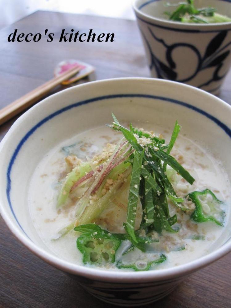 器に、そうめんを盛り、冷やしておいたAを流し入れ、オクラ+きゅうり+薬味を乗せ、すりごまをトッピングしたら、完成♪