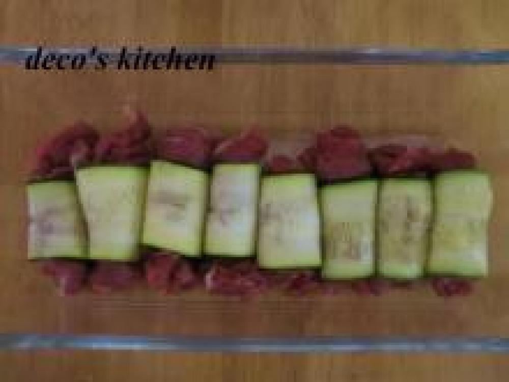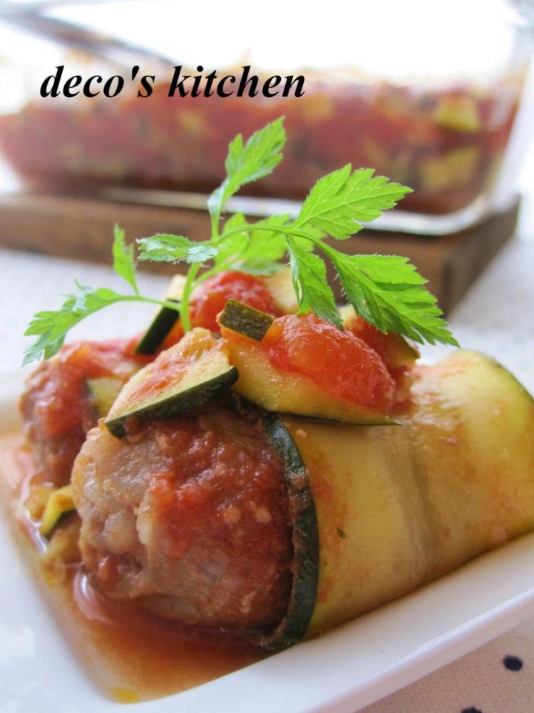 ![]() ズッキーニの上にお肉をのせ、くるくるっと肉を巻いて、さらにズッキーニを一緒に巻く。巻き終わりを下にし、耐熱皿に並べる。