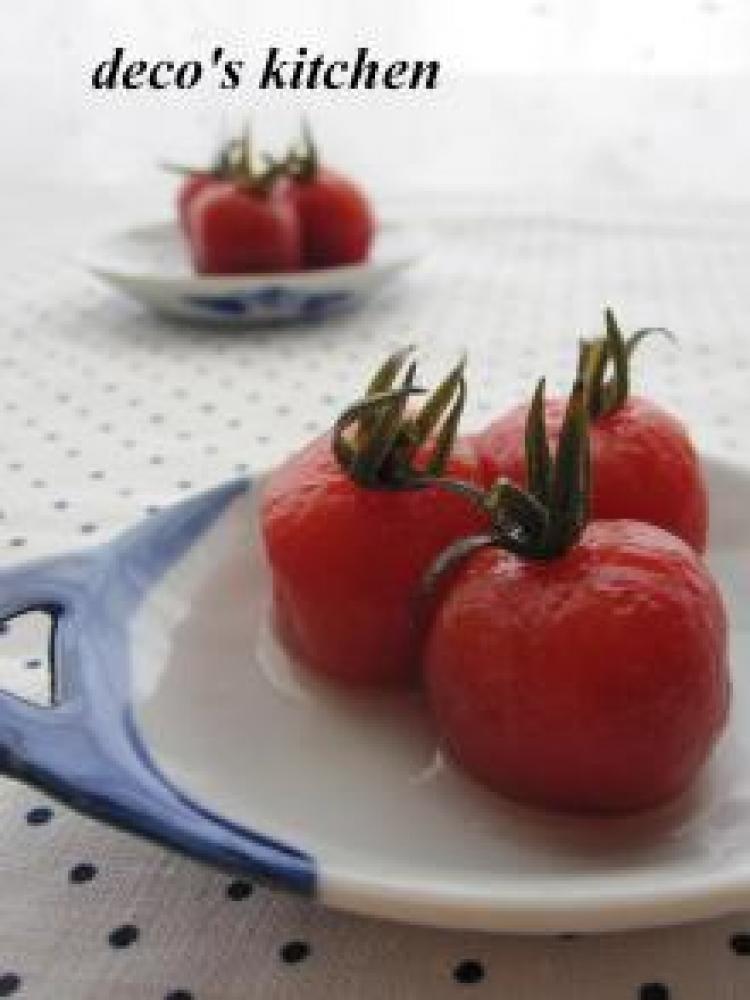 プチトマトを湯むきして、保存容器に①のゆず胡椒甘酢とともに入れて漬ける。→冷蔵庫で一晩置く。
