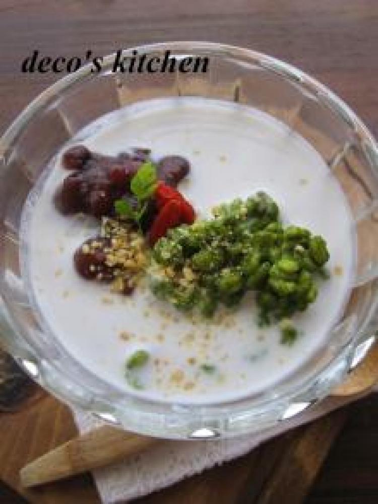器に、②の押麦(1人につき大さじ1~1.5くらい)+あずきを盛り、ココナッツみるくを注ぎ、トッピングして、完成♪