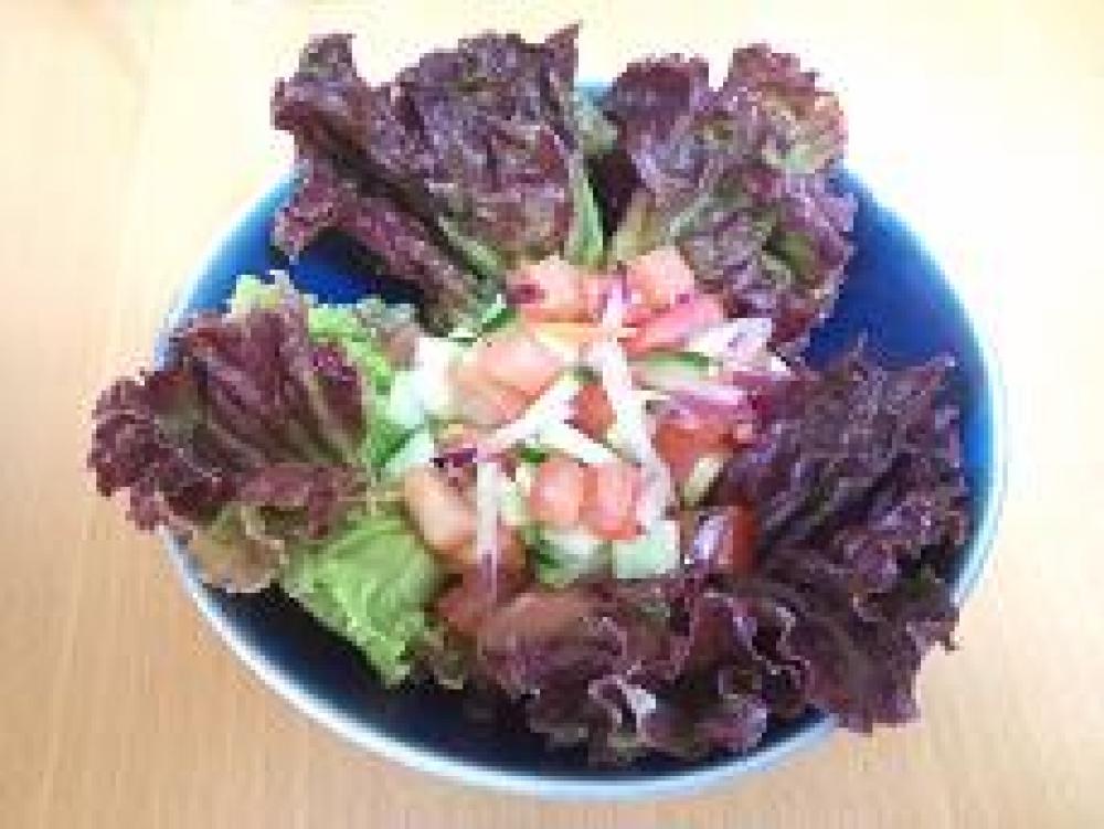 お好きな野菜を適当な大きさに切ります。(今回は、トマト、キュウリ、紫タマネギをサイコロ切りにしました。)