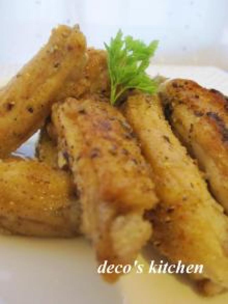☆の材料を混ぜ合わせ、下味をつけた手羽中に、はたきつけ、オリーブオイルを熱したフライパンで皮目から中火でじっくり焼く。