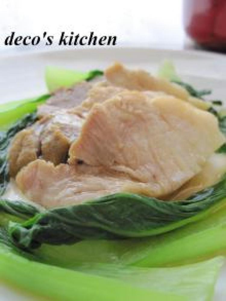 煮込んでる間に、青梗菜を、たっぷりの熱湯+少量の油+塩(すべて分量外)で、さっとゆでる。