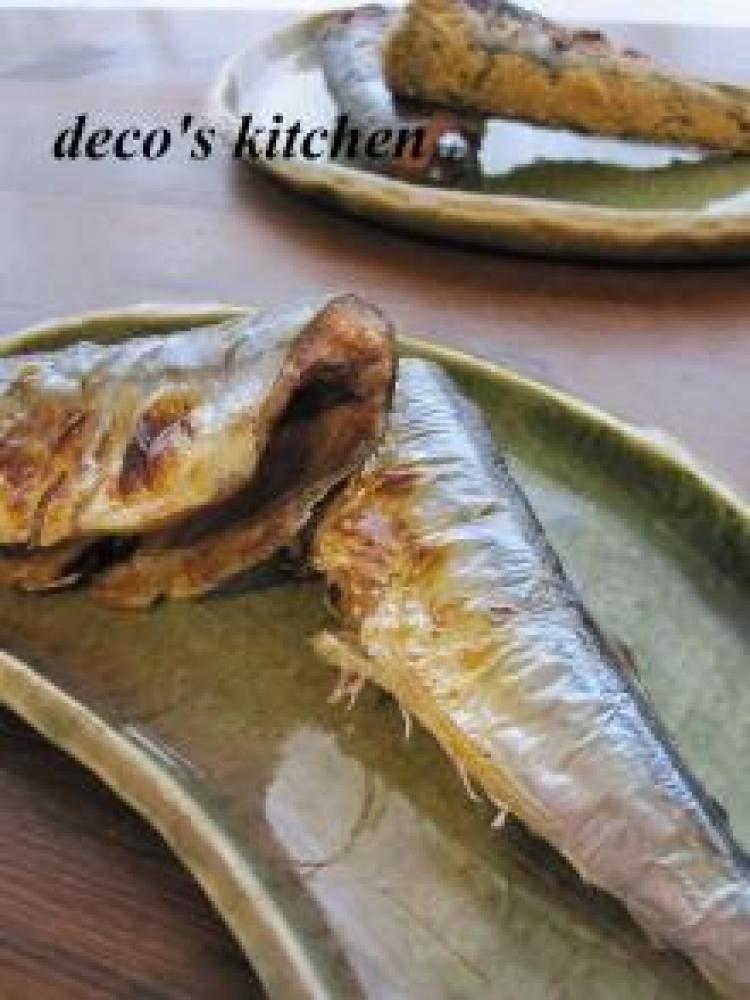 サンマの頭を落とし、内蔵を取って、キレイに洗う(私は半分にカット)水分をふき取り、かる~く塩をふってしばらく置く。