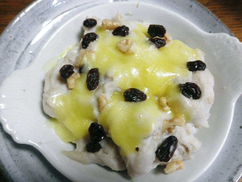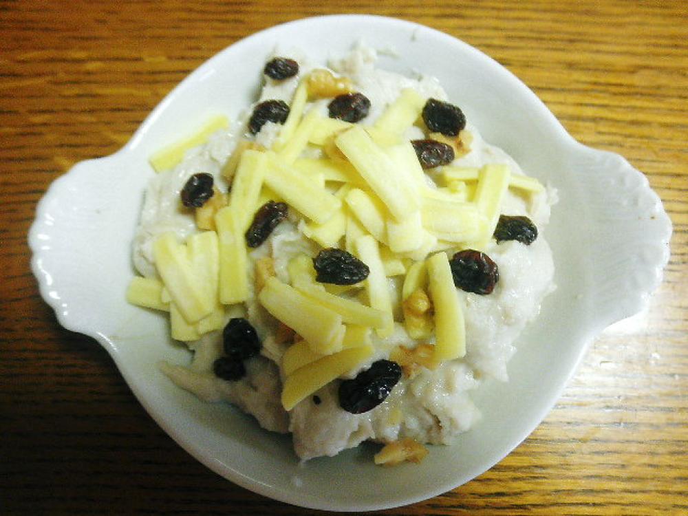 ![]() とろけるチーズ(量は好みで調節)とレーズン、刻んだクルミをのせてトースターで焼く