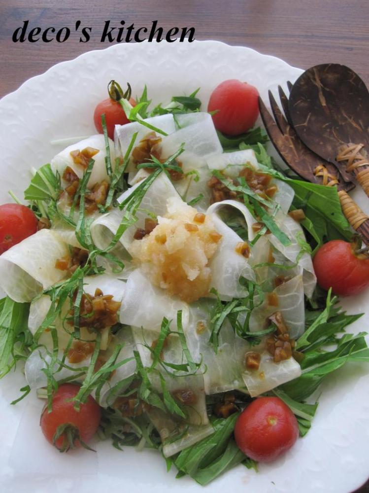 お皿に、水菜+ひらひら大根を盛りつけ、おろし大根+千切りの大葉も盛りつける。プチトマトを飾りドレッシングをかけ完成