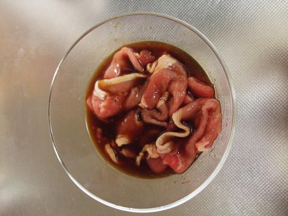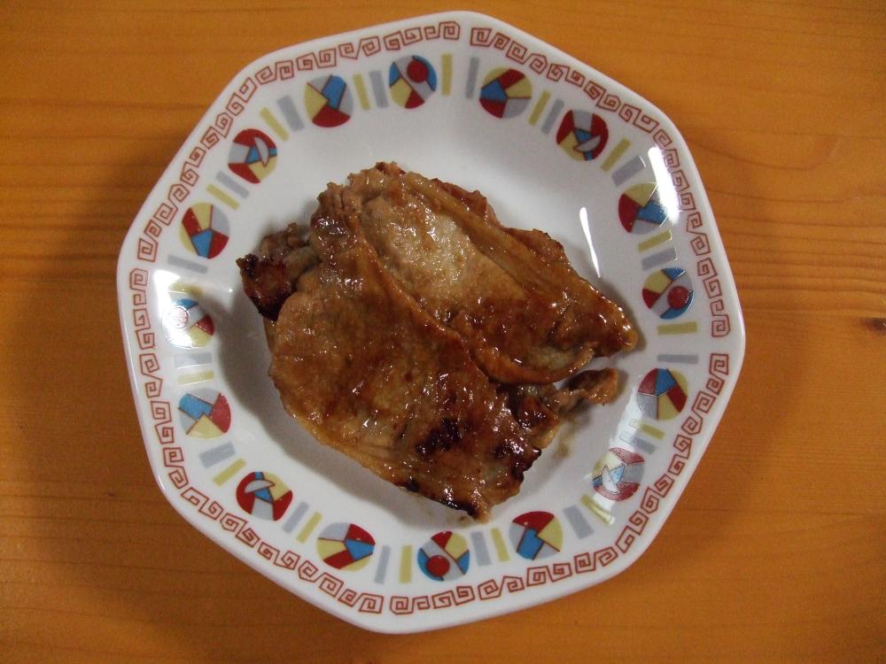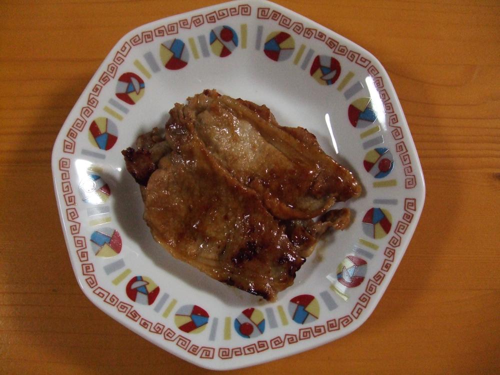 漬け込んだ豚肉を汁気を切り 中火で焼き色が付くまで両面を焼き、 仕上げに漬け汁を加え |