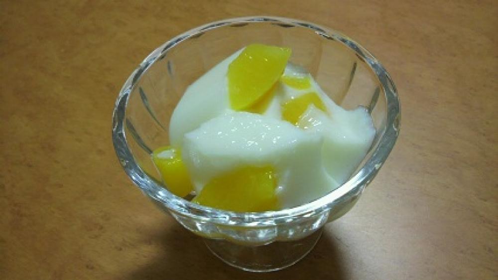 容器に黄桃を切って並べ、少し冷ました③を流し入れ、冷蔵庫で冷やし固めます。