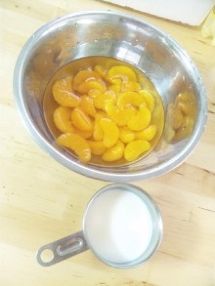 ![]() ゼラチンを3:1に牛乳用をミカン用に分けておきます。みかんの缶詰シロップつかいました。