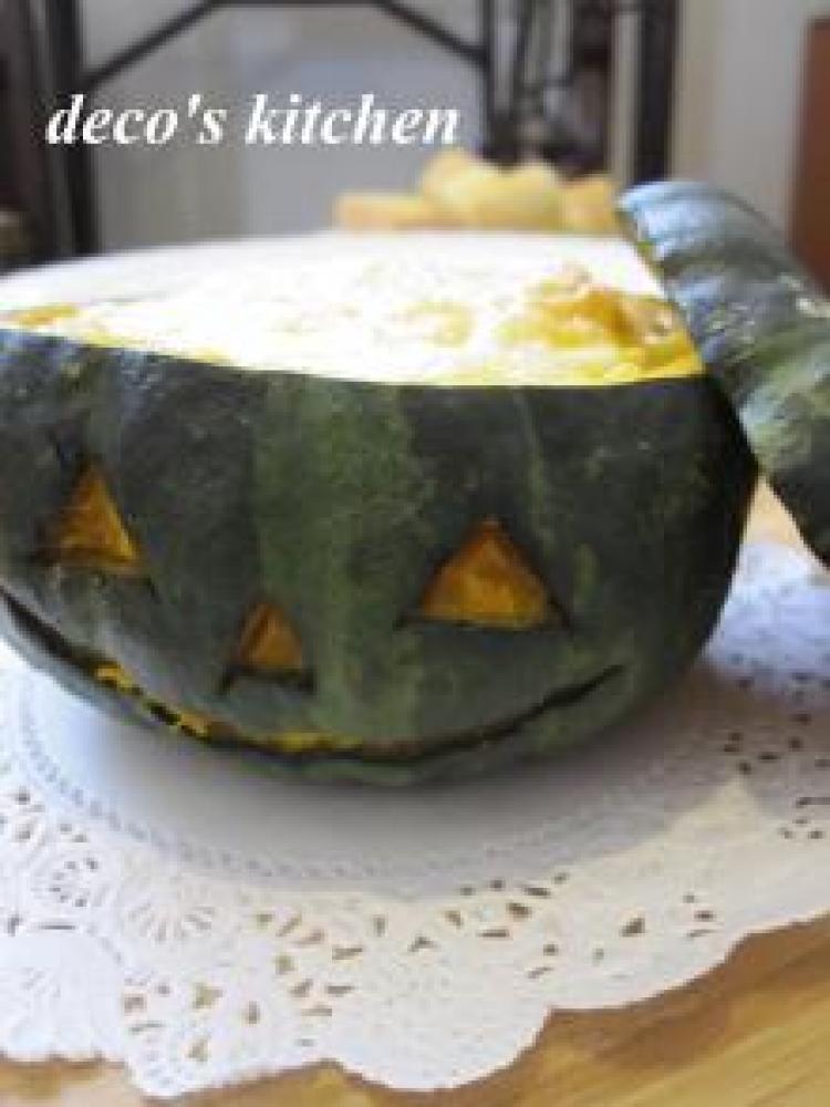 小鍋に、バター+オリーブオイルを熱し、バターを炒め、玉ねぎ+塩こしょうも加えて炒め、くり抜いたかぼちゃも加える。