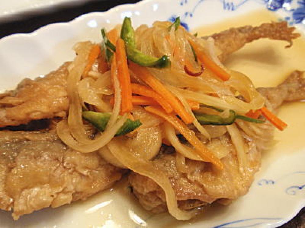 ![]() 全ての鯵を揚げて液に漬けたら、その上から千切りにした野菜を全て入れて粗熱がとれたら蓋をし、冷蔵庫で1日以上漬けこめば完成