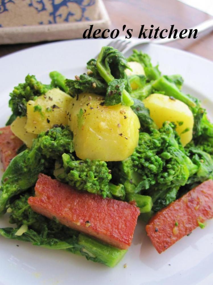香りが移ったらにんにくを取り出し、スパムをじっくり炒めてる。菜の花とじゃがいもを加え強火にし、*の材料も加えさっと炒める