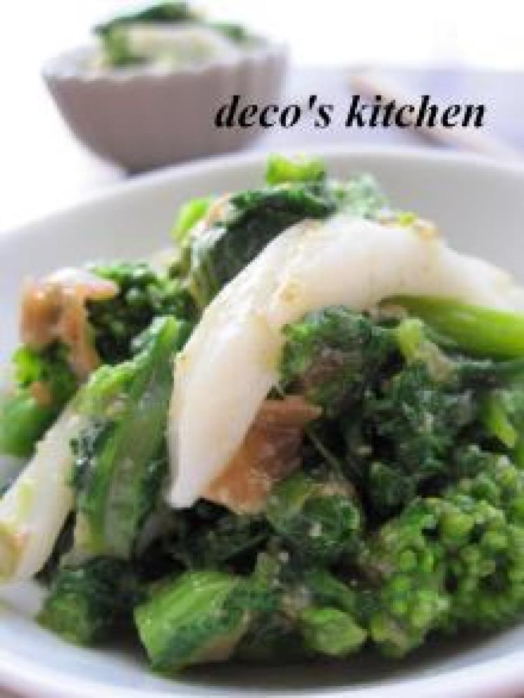 菜の花をさっと塩茹でし、冷水に取り、適当な大きさにカットして絞る。イカもさっと塩茹でし、食べやすい長さに細く切る。