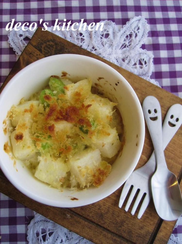 長芋の皮付きをむき、1~1.5cm角くらいにカット。*の材料を混ぜ合わせたソースで、長芋+枝豆を和える。
