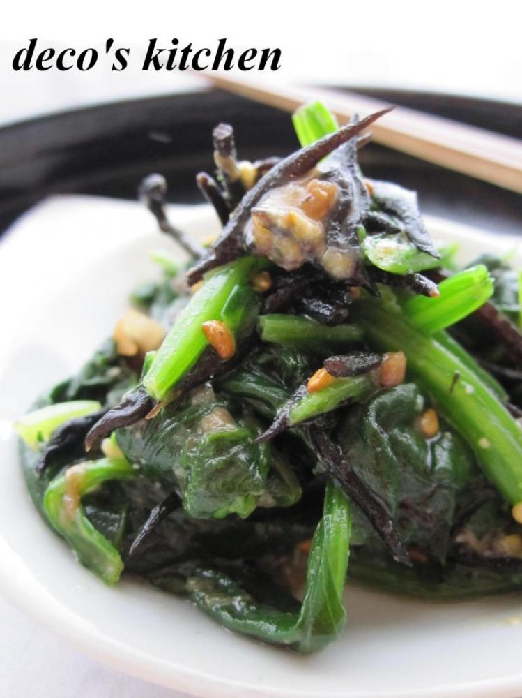 ひじきをさっとゆで、ざるにあげる。ほうれん草は塩ゆでし、水にとり、水気を絞って3cmくらいの長さにカット。