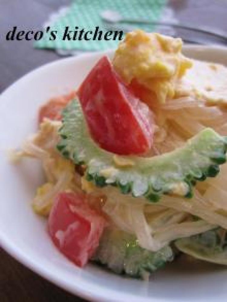 ボールに、*の材料を混ぜ合わせ、ゴーヤ+トマト+炒り卵+春雨+蒸し鶏を入れて、和える。完成!