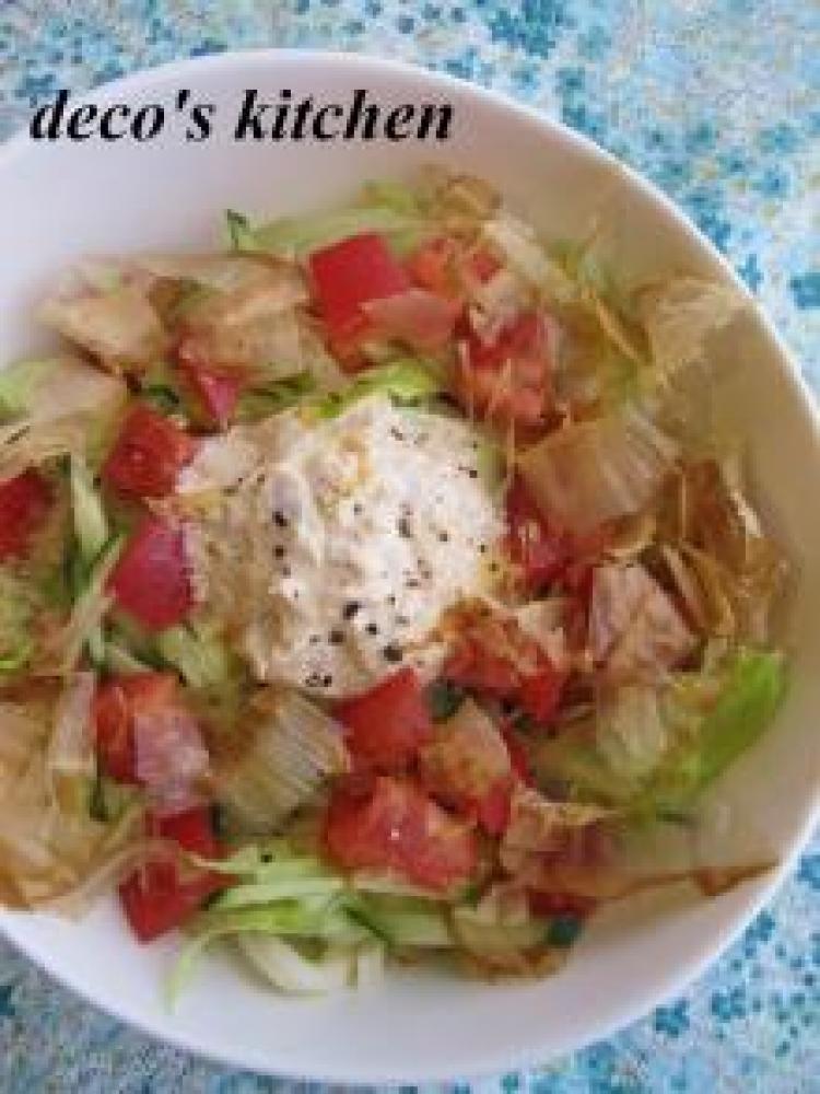 レタス+きゅうり+トマトを盛り付けツナマヨを乗せ、かつお節+ブラックペッパーをトッピングし、めんつゆをぶっかけたら完成♪