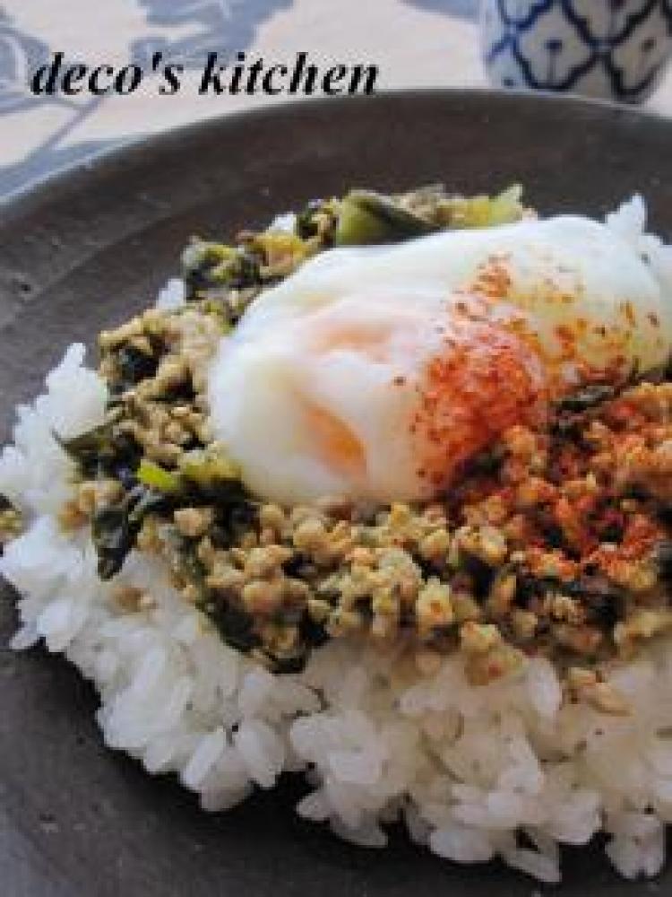 高菜を1cm幅くらいにカット。フライパンにごま油を熱し、豚ひき肉を炒め、完全に肉の色が変わったら、高菜も加えて炒める。