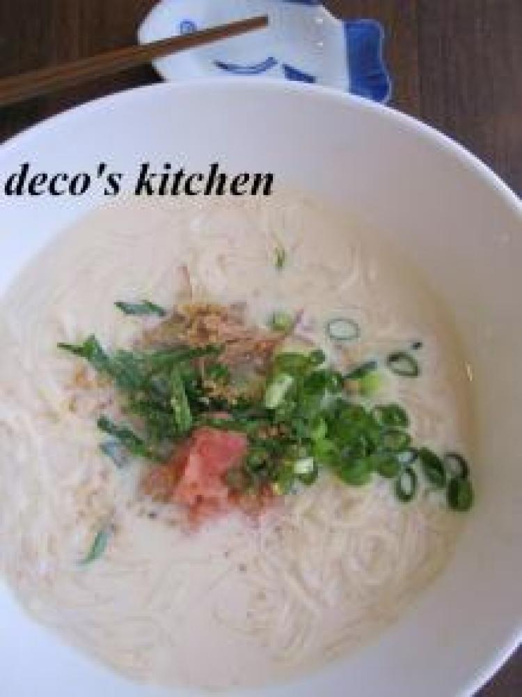 器に、そうめんを盛り、冷やしておいたAとたらこの半分を混ぜ合わせてから流し入れる。