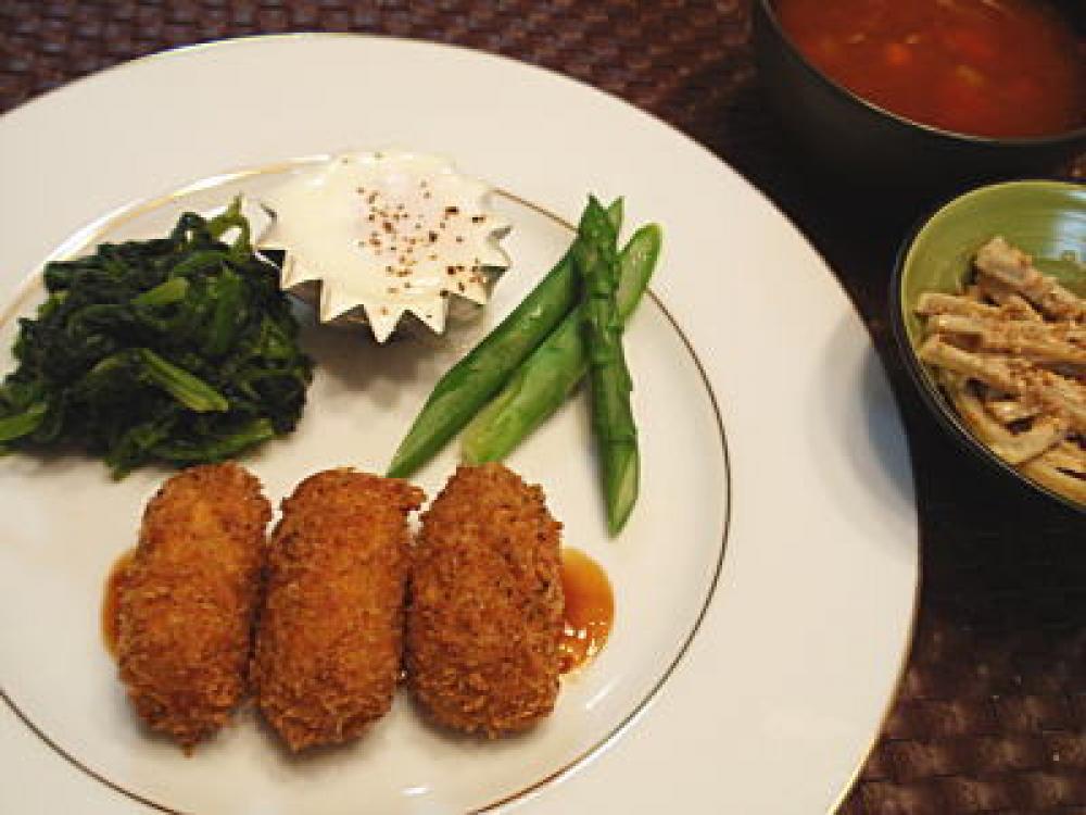 ![]() 手で触れるくらいに固まってきたら、全体を6等分して俵型にまとめ、小麦粉→卵→パン粉の順にまとわせ、油で揚げれば完成です。