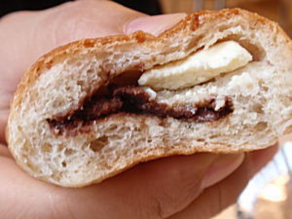☆一次醗酵後の生地に板チョコとクリームチーズを並べて巻きます。