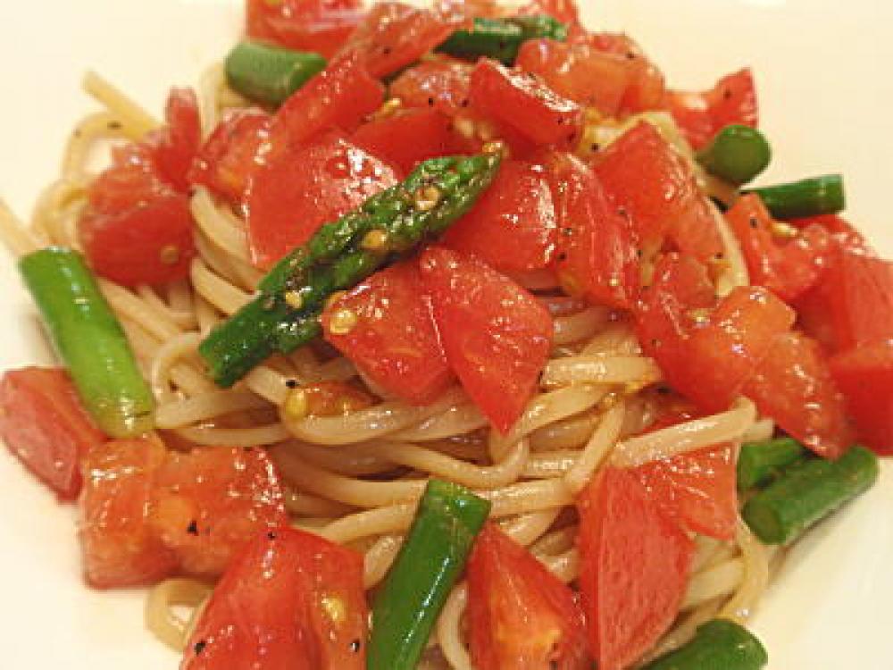 茹でたパスタを流水でよく洗い、最後に氷水または冷蔵庫でよく冷えた水でしっかり冷やして水を切ったら、