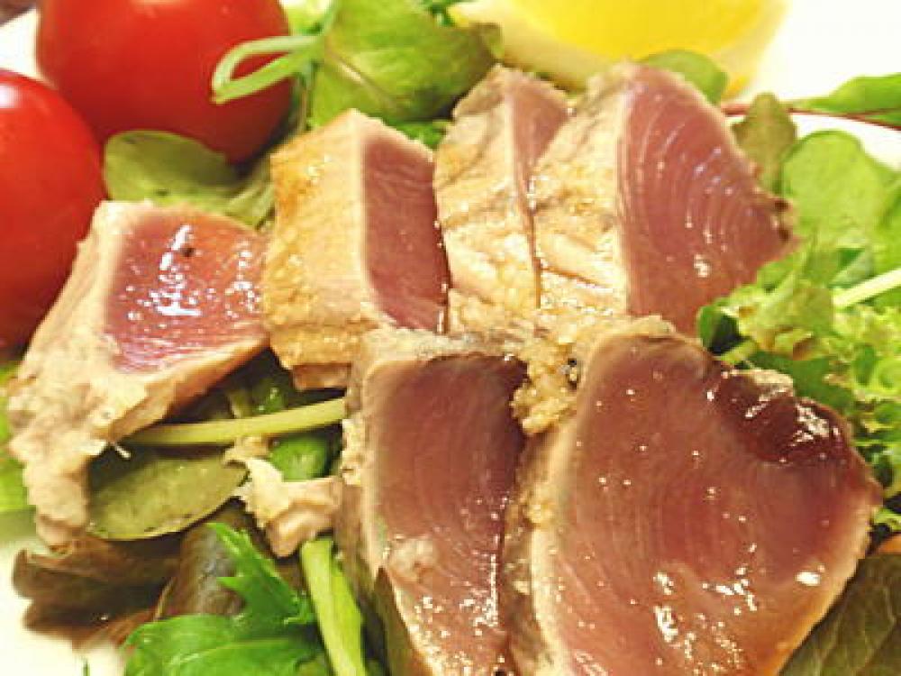 よく冷えたかつおをお好みサイズにカットし、ベビーリーフなどのサラダにのせて、