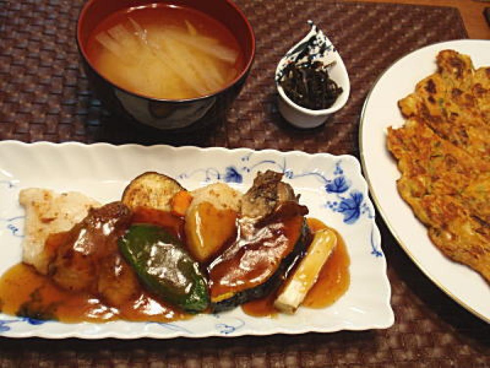 野菜に粉をふり、油で揚げます。(又は焼きます)