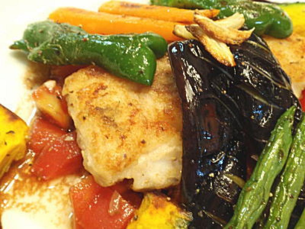 ![]() 8の魚の上に、4のグリルした野菜を盛り付け、最後に煮詰めたバルサミコ酢を周囲にまわしかければ完成です。